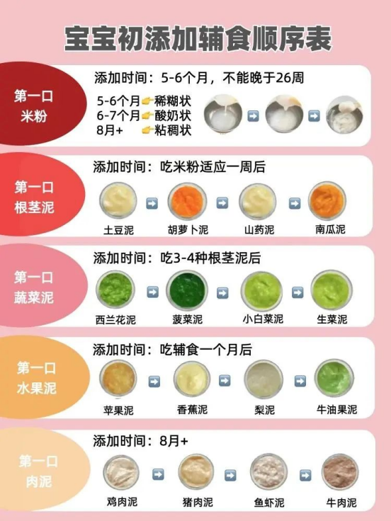 开始添加辅食时,要一种一种逐一添加。婴儿适应了一种食物后再添加另一种食物。一种食物一般要适应5-7天后再考虑添加另一种新的食物。