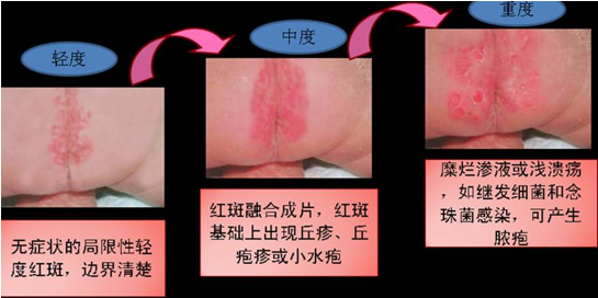 表现为尿布接触部位潮红、破损或红斑、小丘疹、小水疱性皮损,可伴有溃疡、脓性分泌物和糜烂。根据临床表现严重程度,分为轻度尿布性皮炎、中度、重度。图例如下: