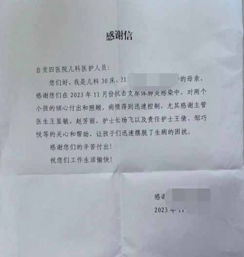 小浩(化名)因“咳嗽1周,发热4天,头痛1天咳嗽1周,发热4天,头痛1天”由外院转入我科住院治疗,考虑“化脓性脑膜炎、重症肺炎”。住院期间,患儿反复发热、头痛、食欲差,病情较重。经科主任周宏、副主任蔡春红及全体医师共同商讨治疗方案,及时对症处理,护士根据病情精心照顾及护理,经治疗后患儿好转出院。在住院期间赵芳丽主治医生及时跟家属沟通,告知病情变化及治疗方案,缓解家属焦虑情绪。赵医生表示,见到每位患儿能健康回家,减少病痛,就是给予我们工作很大的肯定。 无独有偶,就在第二天,我科收到一封来自一双胞胎母亲的感谢信,据了解,双胞胎均因”支原体肺炎”住院,在医护人员共同努力下,均好转出院,虽篇幅不长,语言质朴,但字里行间饱含着对我院儿科医护人员在治疗期间对患儿耐心细致的照顾和帮助之恩、敬意之情,传递着双向奔赴的浓浓医患情。
