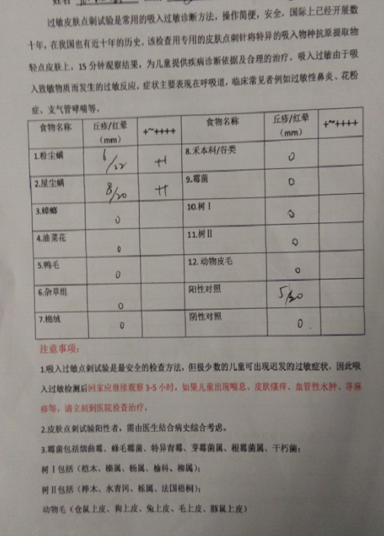 陈医生:我们目前有新方法,无需抽血,即可检测出导致过敏的罪魁祸首。 皮肤点刺实验 皮肤点刺实验是将少量高度纯化的致敏原液体滴于患者前臂、再用点刺针轻轻刺入皮肤表层。 如患者对该过敏原过敏,则会于15min内在点刺部位出现类似蚊虫叮咬的红肿块,出现痒的反应,或者颜色上有改变。通过此方法可筛查出包括食入及吸入的过敏物质。