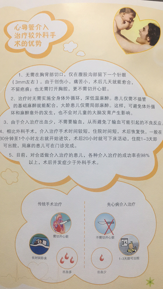 那什么是心导管介入治疗呢?心导管介入治疗是一种微创手术,只需穿刺患儿腹股沟血管,通过一根特制鞘管插入血管,将大小合适的封堵器送至心脏心脏病变部位封堵缺损或未闭合的动脉导管,以达到治疗目的。