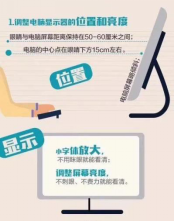 一、从做好网课护眼入手,牢记六个要诀 (1)首先调整电脑显示器的位置。眼睛与电脑屏幕距离保持在50~60cm之间,电脑屏幕略倾斜,电脑的中心点在眼睛下方15cm左右。如果是小字体可以适当调大字体,不用眯眼就能看清。屏幕亮度以不刺眼、不费力能看清为宜。正确的坐姿应是上身挺直、收腹、下颌微收,两下肢并拢。如坐在有靠背的椅子上,则在上述姿势的基础上尽量将腰背紧贴椅背。