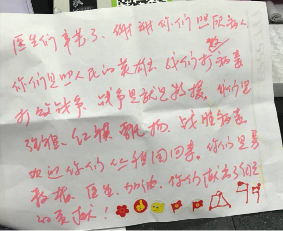 用责任与担当托起未来的希望时间:2020-04-21 浏览量:687 来源: 作者:2020年是非比寻常的一年,新冠肺炎的突然来袭打破了祥和的生活。面对来势汹汹的疫情,面对祖国未来新生一代,四院儿科人员,坚守岗位,用责任与担当,“疫”路为患儿安全保驾护航。 伴随着春天的到来,万物的复苏,疫情的有效控制,我们的生活渐渐回归正轨,在清明时节,我院接诊一名”感染性腹泻”的患儿,在我科医务人员的悉心照料及安全规范的救治下,患儿病情得到有好转,出院那天,小家伙们腼腆的来到医生办公室,稚嫩的小手递出一份份精心准备的感谢信。信里真挚的写下了长长的一段话: