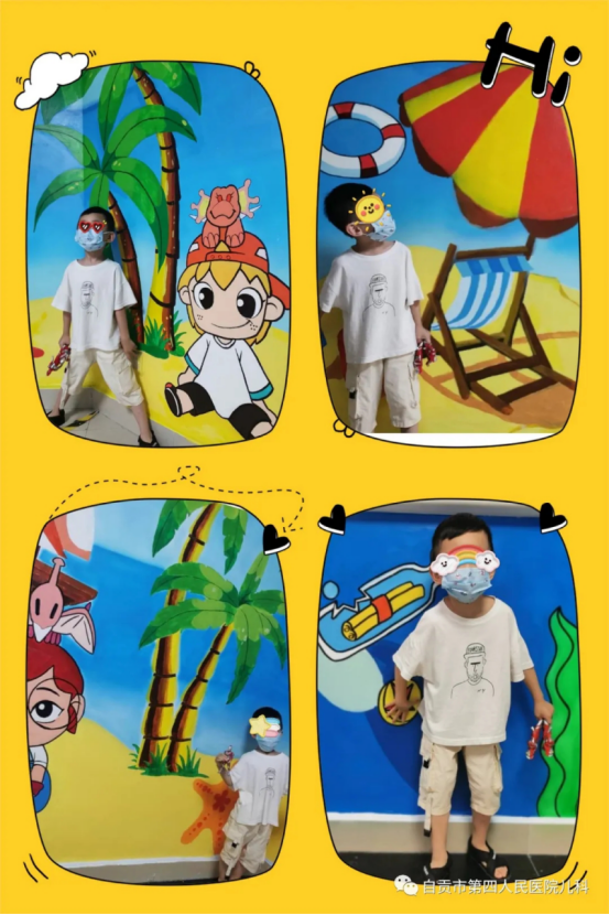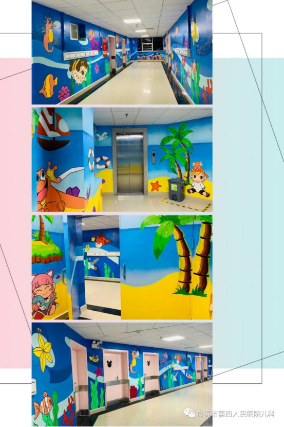 蓝色的海底世界,正代表着健康、平和、希望梦想,可以使儿童的紧张情绪有利于放松和缓解,促进疾病的康复。绿色的小树和海草,代表着顺畅生活、健康呼吸,能够安抚情绪,对哮喘、咳嗽患儿都比较适宜。黄色的沙滩和鱼类,代表着爱和活力,活力未来,使疼痛有利于缓解,心脏跳动更有力,给人安抚宽慰,对疾病的恢复起到调节作用。