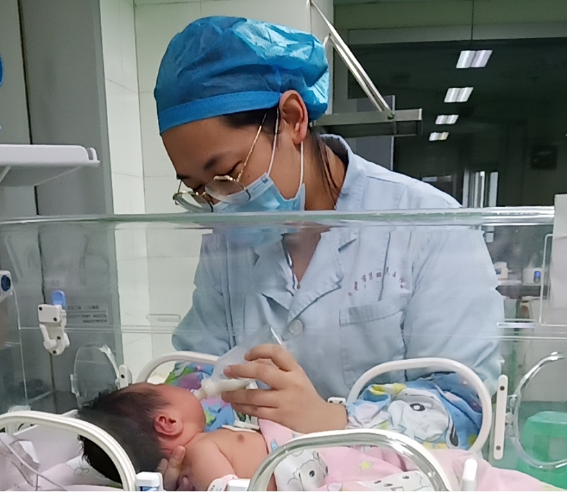 除精准的诊疗技术外,护理质量也同等重要。“小九”刚入NICU时,置于安静的隔离房间,调配科内最先进的暖箱,精密控制温湿度,模拟子宫的柔软“鸟巢”,所有“小九”使用的衣被都经过高压灭菌,严格无菌操作技术及手卫生,严格管道管理、皮肤、口腔护理等。“小九”出生时皮肤非常薄嫩,由于治疗需要,身上有气管插管、胃管、尿管、颈外静脉插管、肤温监测探头、心电监护等多种管道要固定,护士想尽办法,使用先进的敷贴敷料和精细的技巧,即安全固定管道又尽量减少黏贴带来的损伤。临近出院,为了他回家后父母更好的看护,护理团队对家长进行个体化护理指导,让“小九”能顺利回到家庭。