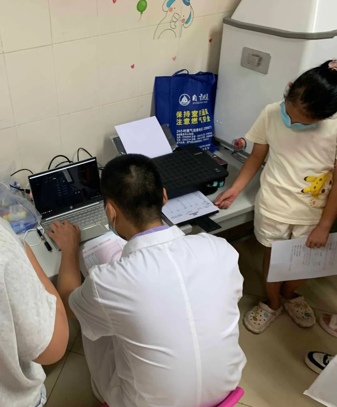 活动第一天早上,义诊区域内,前来参加测骨龄的家长已经排了长长的队伍,大家都很自觉遵守疫情防控规定,带好口罩,保持一米左右距离。儿科的医护人员们为前来就诊的小朋友们仔细做好信息登记,测量身高体重,最后通过骨龄测定仪,给每个小朋友进行了骨龄测定,同时,还为矮小和性早熟问题的孩子们进行抽血,监测孩子们的生长发育关键性指标。