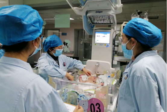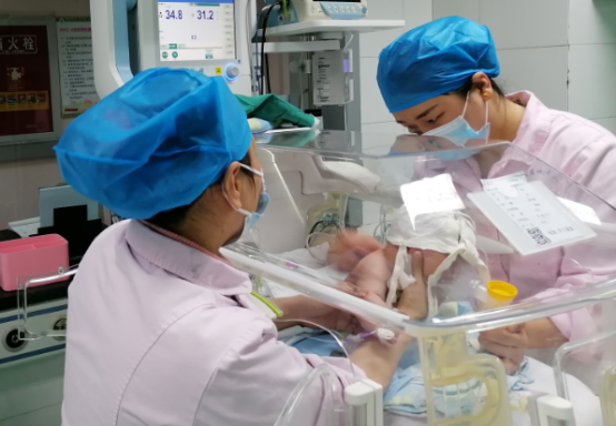孩子进入新生儿室后,医护士人员立即将其置入预热暖箱、呼吸机辅助呼吸、气管吸引、经静脉通道给予抢救药物等紧急救治措施。经过急救,患儿血氧饱和度上升到了90%,但无法持续维持。呼吸衰竭,心力衰竭、重度肺动脉高压……危重情况层出不穷,治疗过程一波三折,病情随时变化,无时无刻不在考验新生儿科医护人员的救治技术和应急能力。每次遇到棘手问题,科室总是立即组织讨论,电话会议、现场会议不下数十次。新生儿室是不留陪护的,孩子全靠医护人员24小时照顾。在孩子病情最危重的时候,即便有一线医护人员24小时值守,二线医师陶珂副主任医师仍不放心,主动提出夜间不回家,守护在新生儿监护室。儿科专家江德勤主任医师,每天上班第一件事就是来到患儿暖箱前查看,询问孩子的情况,认真分析病情,调整治疗方案,为评估孩子进食情况,她会亲自给孩子喂奶。入院沟通时,家属有很多顾虑和担心,态度犹豫。周宏主任及蔡春红副主任反复解释沟通,一次次给家长树立信心,孩子爸爸最后表态:“不转院不放弃,就在这儿医”!在产科住院的母亲,担心、着急、焦虑、想念,每日以泪洗面,产科医务人员也一齐上阵,不断给予心理安抚,平复母亲情绪。