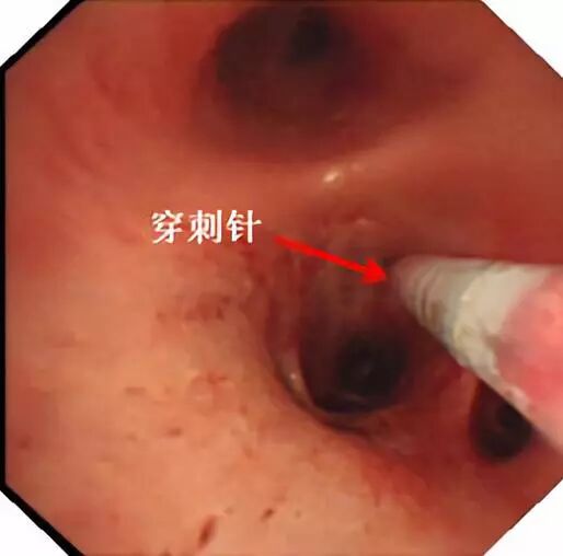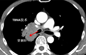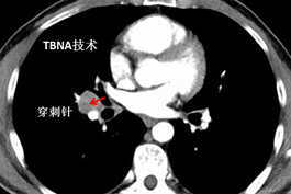 (通过CT片测得病灶于标记点的距离,确定进针角度及深度) 自贡四医院呼吸科对这两例病人开展的是常规TBNA(C-TBNA)技术,均取得了很好的效果。