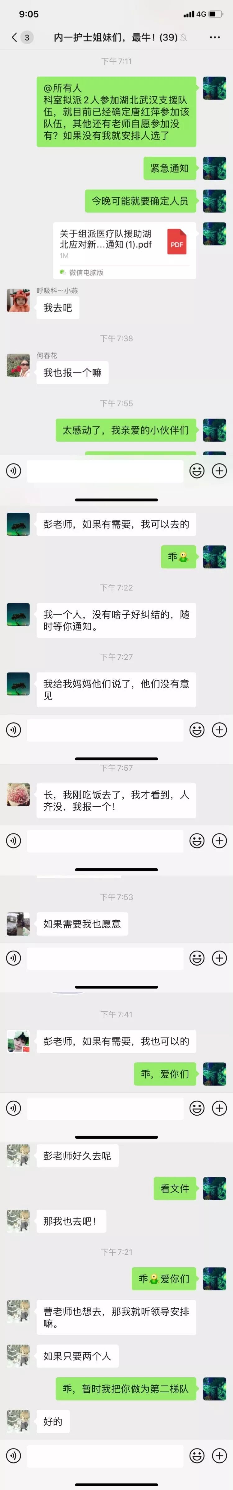 此次任务共派出我院医务人员六名,我科(呼吸与危重症医学科)选派出两名优秀党员同志。病毒无情,人有情,今夜被一声声点名所感动。 左二、左三为呼吸与危重症医学科张宇遥、曹小燕 今晚在接到通知的时刻,两位老师立即前往医院集合。因为工作原因曹老师的丈夫今天没有和家人团圆,接到任务,曹老师安慰好刚上初中的孩子,并打电话请求朋友照顾好女儿,好让她安心去前线。在车上听到电话内容的出租车师傅一边哭一边告诉曹老师:我不收你钱,你一定要注意安全。 而我们另一位勇士,本是独生子女的她,在接到任务后简短的告知父母后便前往集合。