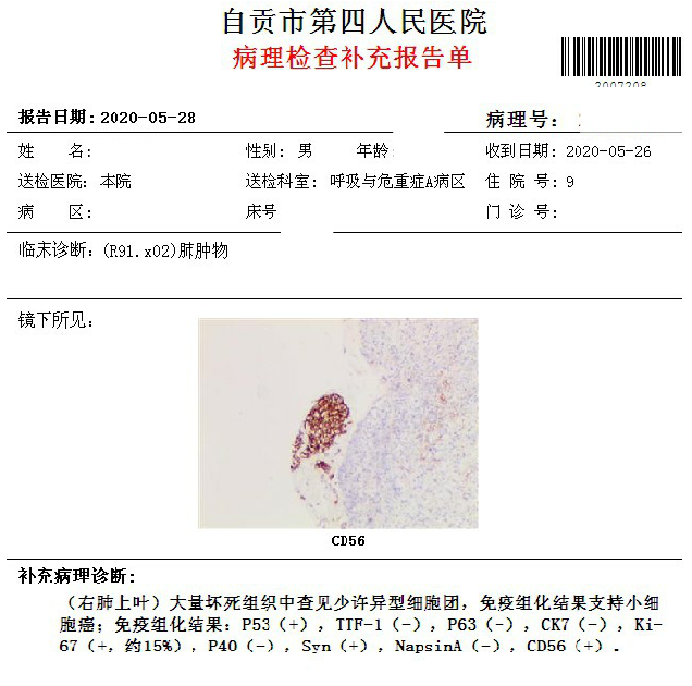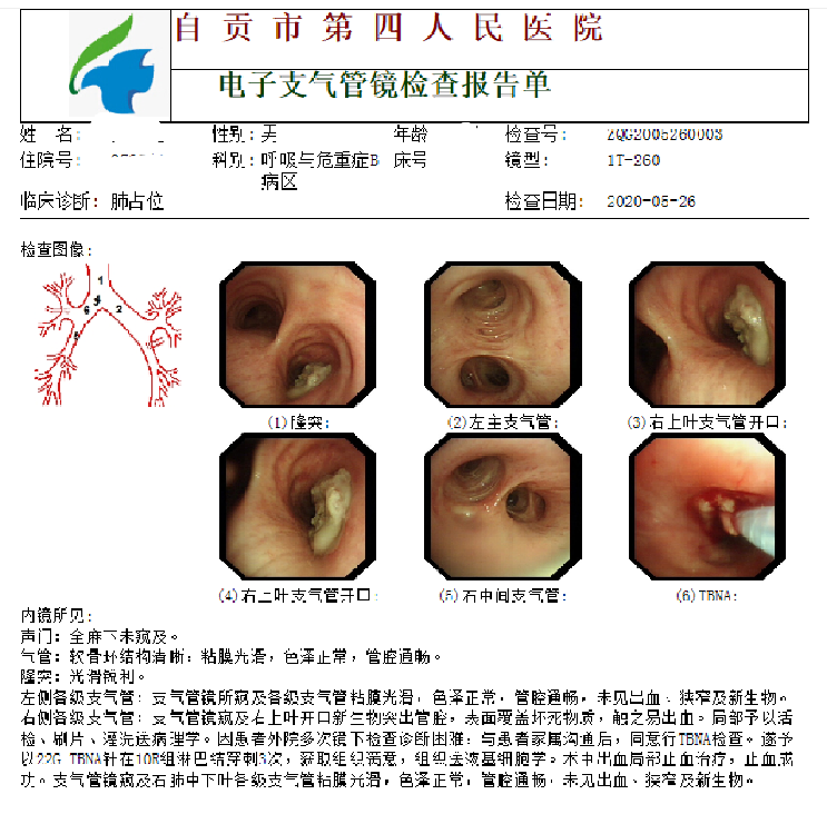事情经过是这样的: 57岁的王先生因咳嗽、咯痰在外院行胸部CT检查提示:右肺上叶支气管开口区占位性病变,伴腋窝淋巴结肿大。患者反复辗转多家医院,院外共行5次活检均未确诊。 王先生在院外做了4次支气管镜下活检及1次经皮肺穿刺活检均未确诊。第1次病理活检:慢性炎症改变伴干酪样坏死。第2次病理活检:送检物炎性坏死、出血及渗出物。第3次病理活检:显示炎症改变。第4次病理活检:慢性炎症改变。第5次病理活检:急慢性炎症改变伴大片坏死。患者遂出院。 随后,患者又到上级医院行PET-CT提示:“右肺门占位伴右肺上叶支气管阻塞,腋窝淋巴结肿大,考虑肿瘤伴转移可能。” 后经我科会诊后转入我科再次行支气管镜下肺活检,并行经支气管针吸活检术(TBNA),病理结果提示小细胞肺癌。患者诊断小细胞肺癌明确,目前患者已完成第一阶段化疗顺利出院。 患者在外院行4次支气管镜下肺活检均提示为炎症或大量坏死组织,未钳取到肿瘤组织,可能主要是肿瘤主要位于支气管腔外,且肿瘤组织表面覆盖大量的坏死组织,而经支气管镜钳夹活检每次只钳取到肿瘤组织表面的坏死物。患者在我科再次支气管镜检查,在行TBNA术后经支气管镜钳夹活检病理仍是大量坏死组织中见少量异形细胞。而TBNA穿刺针可以穿过肿瘤表面的坏死组织到达肿瘤组织中心而取得阳性结果。 TBNA是应用一种特制的带有可弯曲导管的穿刺针,通过支气管镜的活检孔道送入气道内,然后穿透气道壁对气管、支气管腔外病变进行针刺吸引,获得细胞或组织标本进行细胞学和病理学检查的一种技术。广泛应用于紧贴气管、支气管周围病变(结节、肿块、肿大的淋巴结、肺部病灶等)的定性诊断,并可用于恶性肿瘤的临床分期。其在肺门、纵膈病变及气道腔外型病变的诊断中发挥了重要作用,而且较纵膈镜及开胸活检风险小、并发症少,患者及家属容易接受。 目前我科已开展TBNA数十例,并发症少,诊断率高,是气道腔外型病变的优选诊断方法。目前TBNA已是我科常规开展的支气管镜下诊断技术,取得了很好的临床效果。 那么,TBNA技术是一项什么样的技术呢? TBNA是应用一种特制的带有可弯曲导管的穿刺针,通过支气管镜的活检孔道送入气道内,然后穿透气道壁对气管、支气管腔外病变进行针刺吸引,获得细胞或组织标本进行细胞学和病理学检查的一种新技术。广泛应用于紧贴气管、支气管周围病变(结节、肿块、肿大的淋巴结、肺部病灶等)的定性诊断,并可用于恶性肿瘤的临床分期。 据科室副主任马医生介绍,常规TBNA(C-TBNA)在国内已开展近数年,目前已经积累了丰富的临床经验,其在肺门、纵膈病变及气道腔外型病变的诊断中发挥了重要作用,而且较纵膈镜及开胸活检风险小、并发症少,患者及家属容易接受。目前已衍生出超声引导下TBNA、CT引导下TBNA及X线透视下TBNA等众多检查手段,但是价格相对常规TBNA(C-TBNA)明显增高;故目前多数医院仍以常规TBNA为首选。科室利用现有医疗条件,率先在自贡市成功实施了常规经支气管镜针吸活检术,在较短时间内为患者确诊,使患者能得到了及时有效的治疗,受到病员及家属的好评;这标志自贡四医院呼吸与危重症医学科的支气管镜下介入诊疗技术上了一个新的台阶。