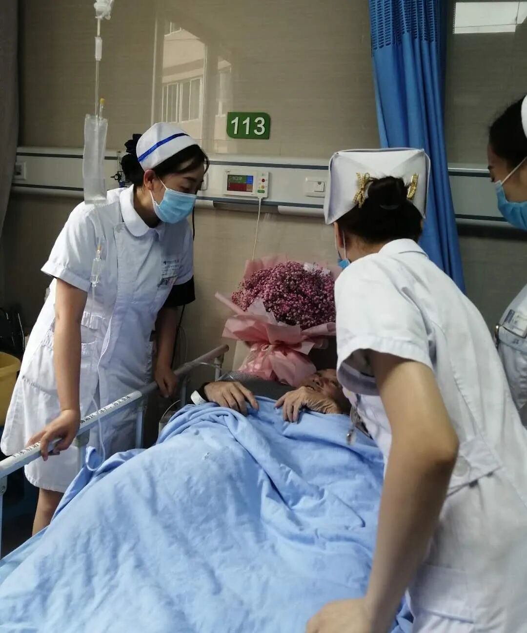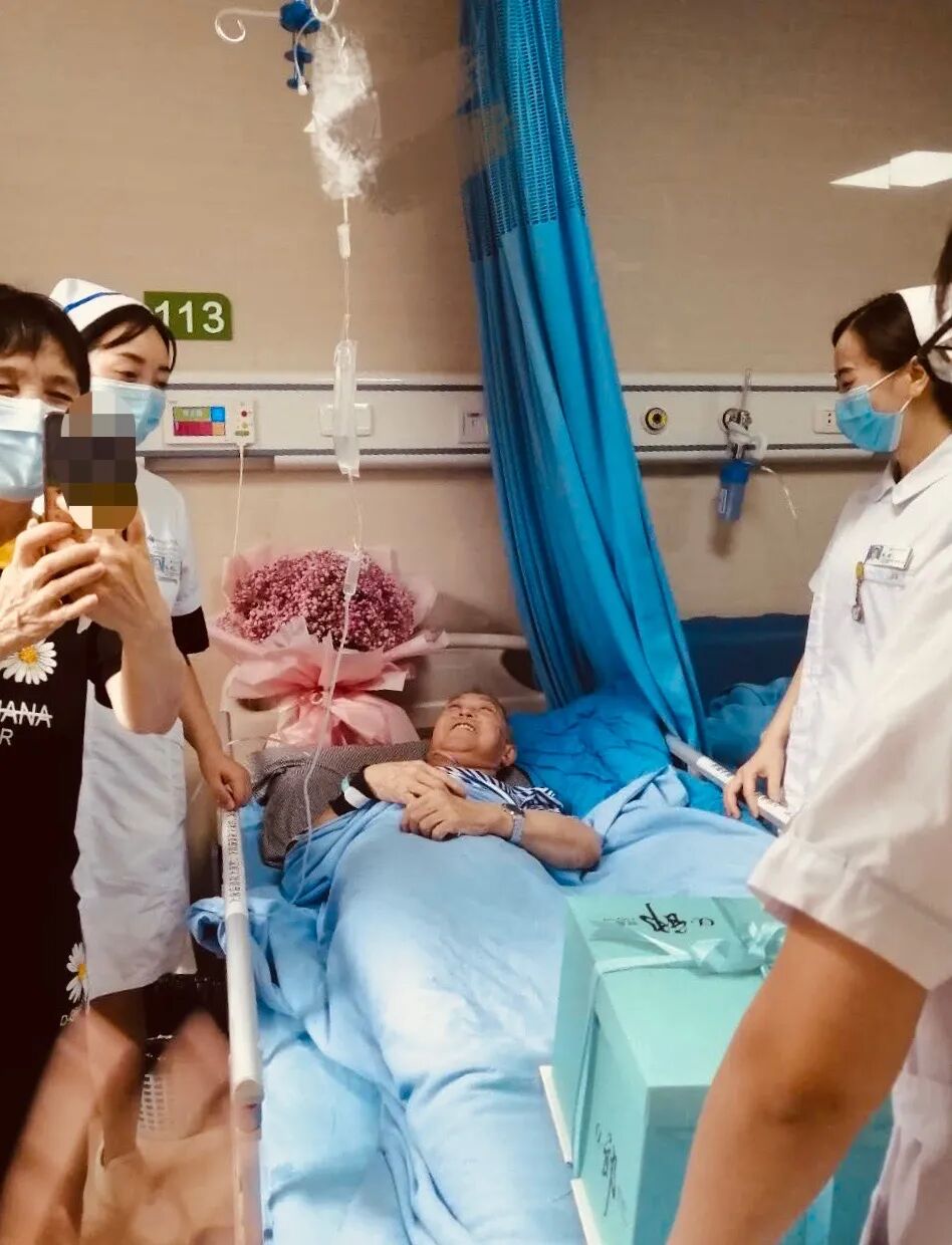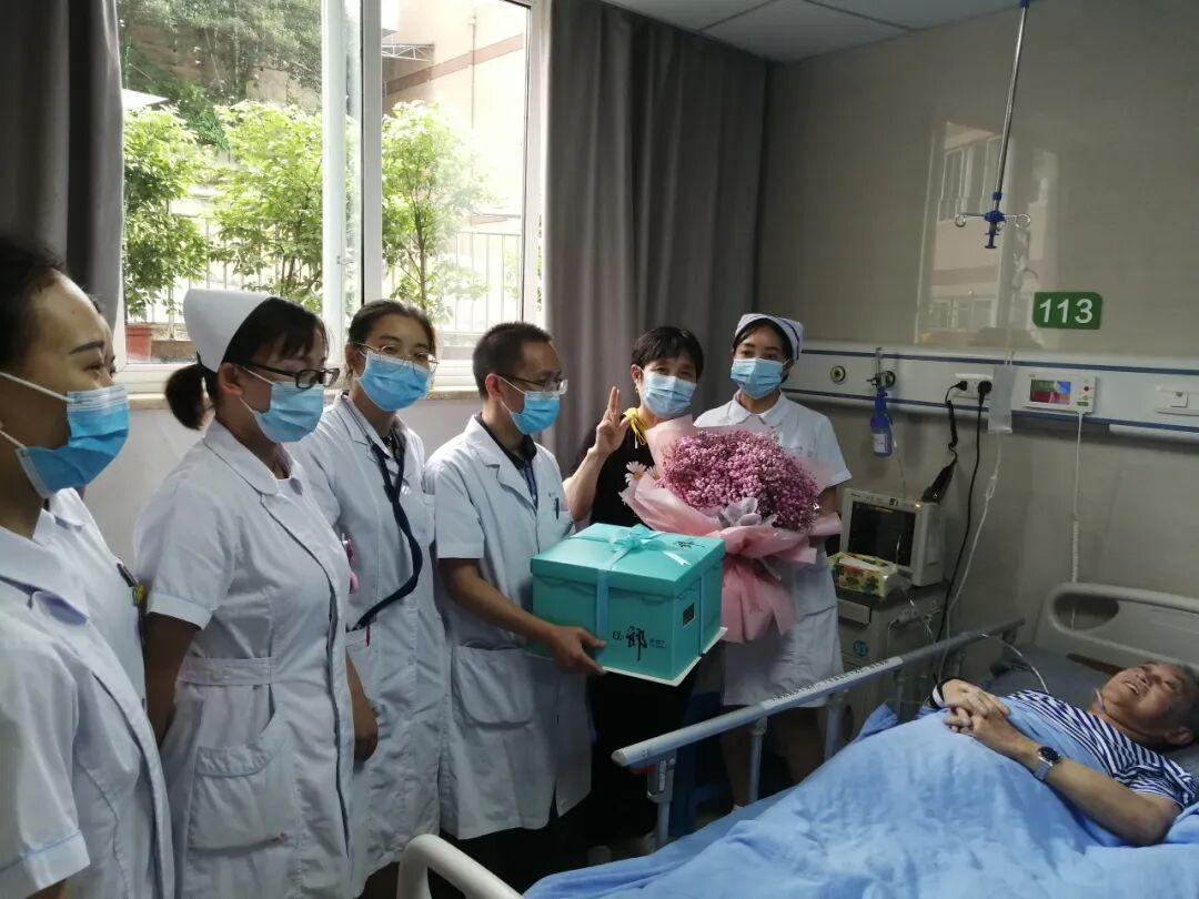 温馨服务,情暖患者—病房里的别样生日!时间:2020-07-12 浏览量:806 来源:自贡市第四人民医院 作者:"人间自有真情在,宜将寸心报春晖",生日对于每个人来说都有特殊的意义,它代表生命与希望。尤其对于自贡市第四人民医院呼吸与危重症医学科113床的张爷爷来说,每天的活动范围仅限于床位与厕所之间的距离,不能时常与家人团聚,这位满脸笑容的爷爷,已经在我科住院长达半年以上了,还与我们医生和护士成为了无话不谈的好朋友,得知7月11日是张爷爷的七十大寿,细心的孙主任决定为他策划一场秘密惊喜,委托了张爷爷的主管医生唐亮住院医师、彭娟护士长、廖慧住院医师、韦鑫护师、罗欢护师等医务人员带着蛋糕和鲜花来到病人的床前,为他送上最真挚的祝福。 "祝你生日快乐、祝你早日康复......."在医院的病房里,伴随着美好的祝福,张爷爷和他的爱人与医护人员一起唱着生日歌,许下心中的愿望,共同度过一个特殊又有意义的生日。