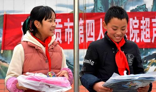 义诊结束后,自贡市第四人民医院超声医学科为全校学生献上一份爱心,捐赠书包、文具等学习用品。