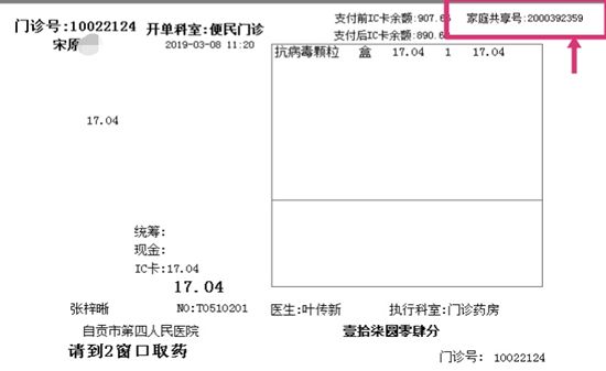 患者在使用家庭成员医保卡时,发票上会清楚显示家庭共享号的卡号、个人账户使用前及使用后余额,账目清楚,清晰明了。