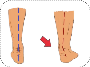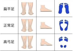 后观足后踝,直线正常,向内弯曲属扁平足。