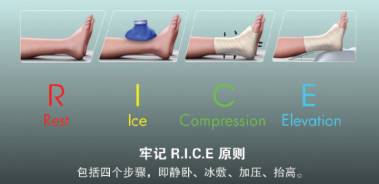 停止走动,让受伤部位静止休息,防止二次损伤,减轻组织渗出、肿胀。