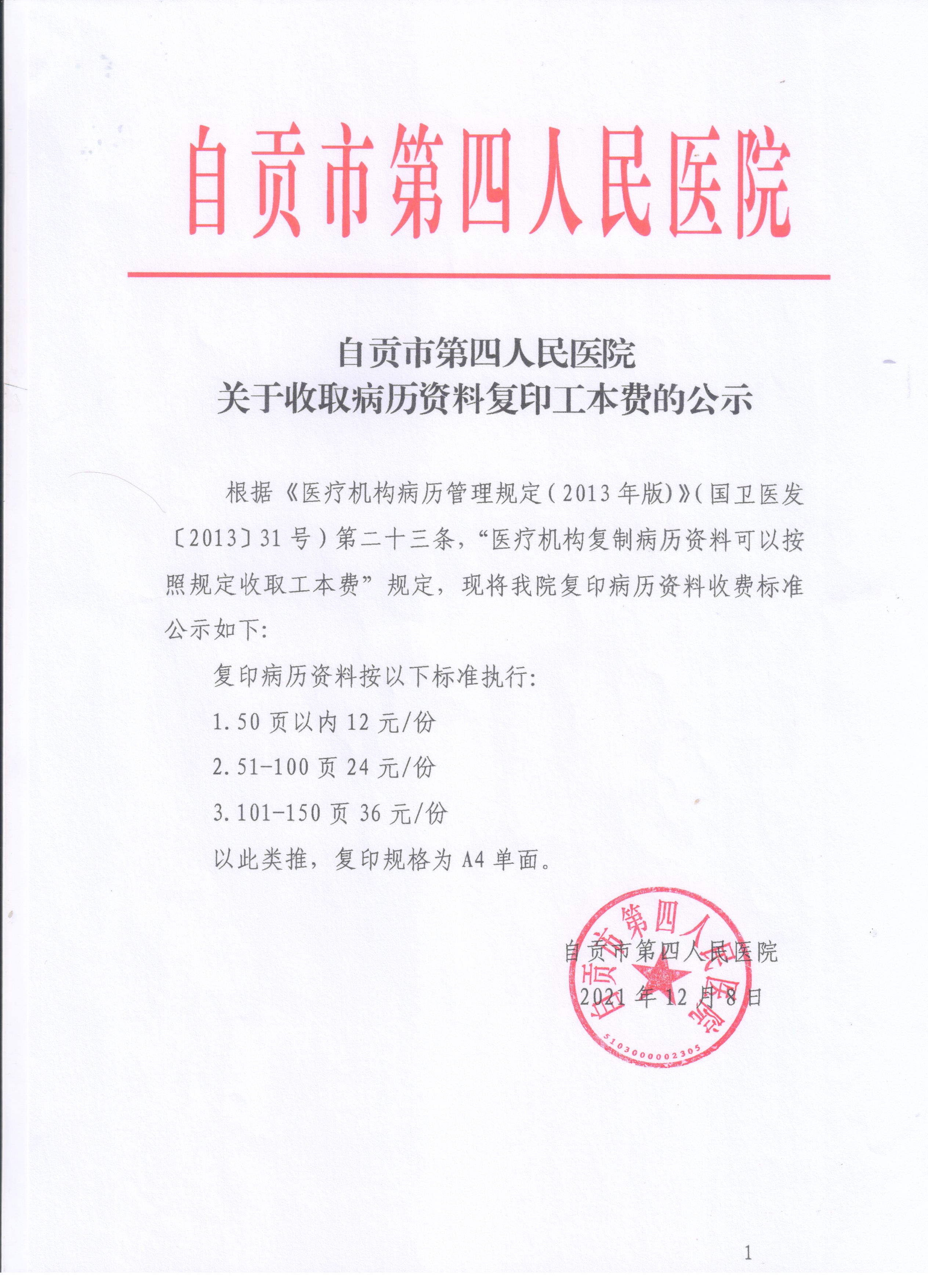 病历复印须知现已提供现场复印、自助打印和微信预约快递服务。 一、微信预约快递服务 关注“自贡市第四人民医院”微信公众号,进入“住院服务”→“住院服务”→“病案复印”,按照系统提示,完成注册、信息验证、所需住院病案信息、填写邮寄地址,通过医院信息科审核、打印后,即可查询订单服务状态和快递信息。温馨提示快递费用到付,请保持电话畅通。 二、自助打印服务 提供2020年以后出院目出院时间满30个工作目的病案自助打印,需本人和委托人身份证《视为患者本人的授权》。 新生儿、未成年人、未办理第二代身份证人员,请选择微信预约服务或现场打印。 地址:市第四人民医院汇东院区门诊大厅自助打印区域。 服务时间:每日7:30-17:30 三、现场打印服务 (一)等待时间。一般情况下,患者出院10个工作日后方可到信息科申请复印相关材料。但为确保服务,来院前请致电0813-8229154核实病案是否可以复印。 (二)窗口服务时间级地点 工作日:上午8:30-12:00和下午14:30-17:30(注:周末和法定节假日不受理复印病案业务)。 地点1:市第四人民医院南湖总院门诊一站式服务中心。 地点2:市第四人民医院南湖总院综合住院楼2楼,病历复印窗口。 (三)申请人需提供的材料 复印病案申请人所需提供材料依据国家卫生和计划生育委员会、国家中医药管理局《关于印发<医疗机构病历管理规定(2013年版)>的通知》(国卫医发(2013)31号)执行,请申请人带齐所需材料到信息科复印病案。《医疗机构病历管理规定(2013年版)》部分要求如下: 1.医疗机构应当指定部门或者专(兼)职人员负责受理复制病历资料的申请。受理申请时,应当要求申请人提供有关证明材料,并对申请材料的形式进行审核。 (1)申请人为患者本人的,应当提供其有效身份证明; (2)申请人为患者代理人的,应当提供患者及其代理人的有效身份证明,以及代理人与患者代理关系的法定证明材料和授权委托书; (3)申请人为死亡患者法定继承人的,应当提供患者死亡证明死亡患者法定继承人的有效身份证明,死亡患者与法定继承人关系的法定证明材料; (4)申请人为死亡患者法定继承人代理人的,应当提供患者死亡证明、死亡患者法定继承人及其代理人的有效身份证明,死亡患者与法定继承人关系的法定证明材料,代理人与法定继承人代理关系的法定证明材料及授权委托书。 2.公安、司法、人力资源社会保障、保险以及负责医疗事故技术鉴定的部门,因办理案件、依法实施专业技术鉴定、医疗保险审核或仲裁、商业保险审核等需要,提出审核、查阅或者复制病历资料要求的,经办人员提供以下证明材医疗机构可以根据需要提供患者部分或全部病历: (1)该行政机关、司法机关、保险或者负责医疗事故技术鉴定部门出具的调取病历的法定证明; (2)经办人本人有效身份证明; (3)经办人本人有效工作证明(需与该行政机关、司法机关、保险或者负责医疗事故技术鉴定部门一致)。 3.保险机构因商业保险审核等需要,提出审核、查阅或者复制病历资料要求的,还应当提供保险合同复印件、患者本人或者其代理人同意的法定证明材料;患者死亡的,应当提供保险合同复印件、死亡患者法定继承人或者其代理人同意的法定证明材料。合同或者法律另有规定的除外。 4.住院病历由医疗机构负责保管。 5.医疗机构复制病历资料,可以按照规定收取工本费。 四、收费标准 50页以内12元/份,51-100页24元/份,101-150页36元/份,以此类推;复印规格为A4单面。 注:详情请来电咨询院信息科,联系电话:0813-8229154 自贡市第四人民医院