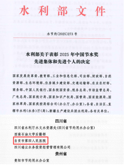 12月26日,首届中国节水奖颁奖会在京举行。自贡市第四人民医院凭借在节水工作中的扎实举措与显著成效,荣获“中国节水奖先进集体”称号,成为四川省唯一获此殊荣的医疗机构。据悉,中国节水奖由水利部主办,每三年评选一次,是我国节水领域的最高荣誉,此次获奖标志着医院在节水管理与实践方面得到国家层面的高度认可。
