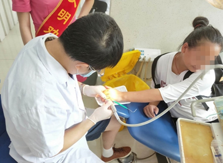 来到口腔科大厅,刚好遇到正从诊断室出来的副主任医师王宁楠,导医护士简单向王宁楠介绍了刘女士的情况后,他便立即为患者查看手指情况。