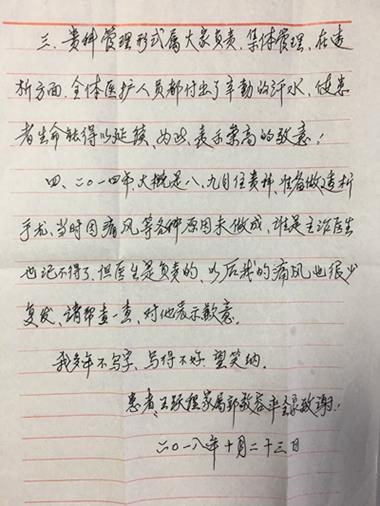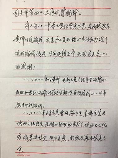 王爷爷是市四医院肾病内科的一名患者,近日,王爷爷来到肾病内科,给医护人员带来了他的“心意”,同时还给科室写了一封感谢信。