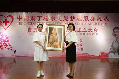 自贡市第四人民医院护理部主任、自贡市护理学会分队副队长聂臣聪从南丁格尔志愿护理服务总队副理事长、分管四川区域副理事长、第44届南丁格尔奖章获得者成翼娟手中接过南丁格尔画像。
