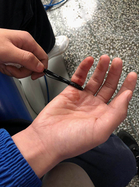 据了解,几小时前,少年将右手小指伸进刀柄环内玩耍,引发小指嵌顿。由于消防类器材切割刀柄环,极易损伤小指,便寻求其他办法。经人介绍市四医院口腔科有精密器械及技术,可以解决这一难题,所以就赶紧过来了......