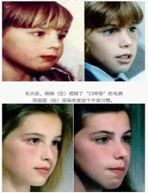 问题五:我们应该如何预防和改善腺样体面容呢? 首先家长要提高警惕,如果发现娃儿有口呼吸的现象,则应立即于耳鼻喉科就诊,确定是否存在病理性腺样体肥大,并采用适宜的治疗方式,如药物或腺样体手术,恢复娃娃的上呼吸道形态及功能。 其次,应于口腔科就诊,检查是否存在口呼吸和牙颌颅面畸形,因为口呼吸会导致腺样体面容及上气道阻塞加重,甚至诱导儿童OSAHS 的发生。 对于存在口呼吸但没有发生腺样体面容的患儿,只需要在口腔正畸医师的指导下接受专业的唇肌功能训练以纠正口呼吸的不良习惯。 对于已经产生了牙颌颅面畸形即腺样体面容的患儿,则需立即进行口腔矫正治疗,主要包括下颌前移和上颌快速扩大及上颌骨前牵引,以防止面部畸形进一步加重等严重后果。更为重要的是,国外研究也已经证实,口呼吸造成的颌面部发育异常如及时去除病因,部分患者可以实现畸形逆转。 下面这对双胞胎姐妹花小时候都有口呼吸的习惯,但后来妹妹(左侧)遵从口腔正畸医师的治疗,戒除了口呼吸的毛病,但姐姐(右侧)没有改变这个不良习惯,青春期过后容貌出现了巨大的差异。