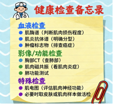 ?血液检查:肌酶谱(判断肌肉损伤程度)、肌炎抗体谱(明确分型)、肿瘤标志物(排查癌症) ?影像/功能检查:胸部CT(查肺部)、肌肉磁共振(看肌肉炎症)、肺功能测试 ?特殊检查:肌电图(评估肌肉神经功能),必要时取皮肤或肌肉样本做活检 日常防护:4件事帮你稳住病情 确诊后,做好日常护理能辅助控制病情,减少复发。